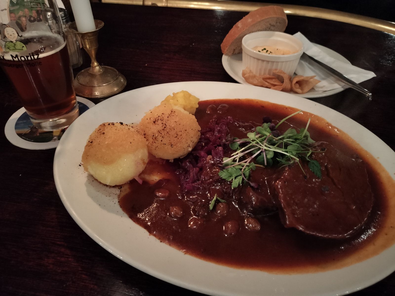 夕食に、max & moritzっていうレストランでrheuninuchser sauberbraten食べた(意味はわからないので写真見てね)。やわらかい肉にベリーソース+デミグラスソースみたいなやつがかかっている。おいしい!金のかかる食事をしてなかったのでちょっと泣きそうになる。pilsnerくれっていったら、ハウスビールおすすめされたのでそれにしたら、思ったより強かった…。付け合わせの、パンとバターと芋?でできたKnödelもよかった。dumplingみたいな物って説明されたけど全然餃子ではない。なんか、もそもそっとしてる。ベビーカステラが30歳ぐらいになったらこんな感じなのかな?良い喩えがわからない。チップ入れて33EUR. 高いけどしゃーない。
